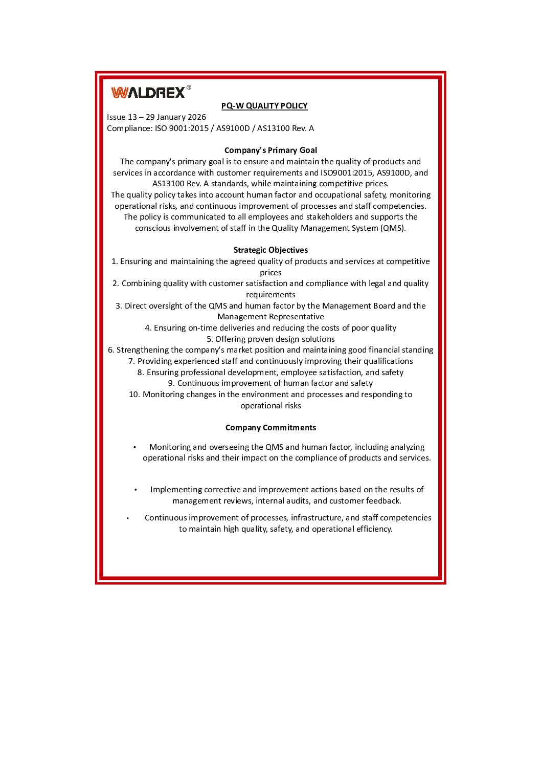 Our goal is to deliver products and services of the highest quality that meet the expectations and requirements of our customers. We treat quality as a key element of our organization’s development and the foundation for building long-term business relationships.